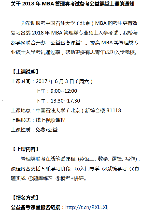 关于2018年MBA管理类考试备考公益课堂上课的通知