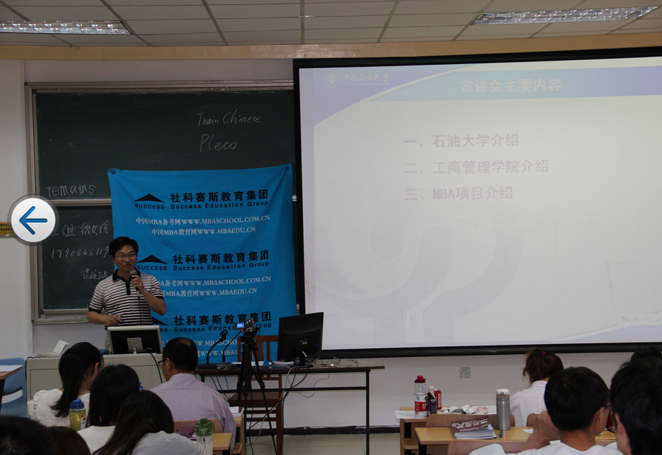 2014年6月7日中国天天色天天(北京)MBA招生宣讲会走进北京语言大学--社科赛斯教育集团MBA备考考生课堂。石大工商管理学院副院长、MBA教育中心主任郭海涛博士首先对天天色天天做了概括性介绍,并就石大MBA项目的现状、录取人数、招生政策、学费等几个方面集中说明了MBA报考及培养中同学们关心的问题。他指出,石大MBA在能源领域有着独特的学科优势,6大能源特色课程帮助学员提高专业素养,在石大学习MBA的收获之一是可以快速结识到能源领域的人脉,对于今后的职业选择是非常有好处的。