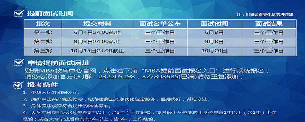 提前面试报名方式:登录MBA教育中心官网,点击右下角“MBA提前面试报名入口”进行注册并报名;关注申请进度关注面试资格。