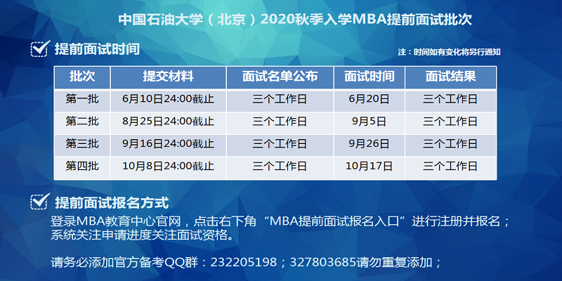 提前面试报名方式:登录MBA教育中心官网,点击右下角“MBA提前面试报名入口”进行注册并报名;关注申请进度关注面试资格。