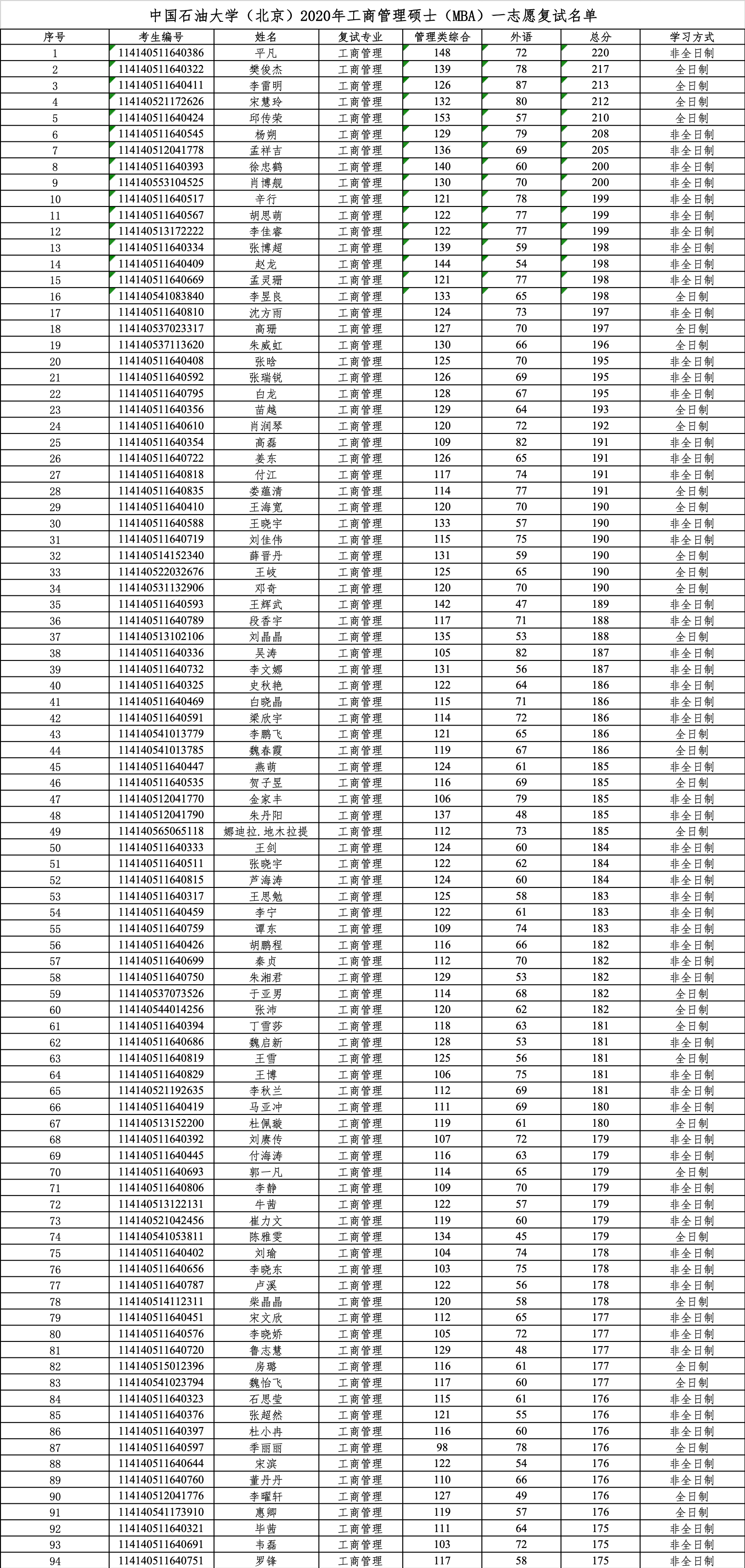 中国天天色天天(北京)2020年工商管理硕士(MBA)一志愿复试名单