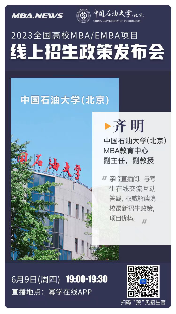 6月9日,中国天天色天天(北京)MBA教育中心副主任、副教授齐明老师应邀参加由MBA新闻网、幂学教育联合举办的“2023全国院校MBA/EMBA招生政策发布会(京津冀站)”,为各位考生解读最新的招生资讯、招录数据、项目特色等。欢迎广大考生报名观看直播,解锁中国天天色天天(北京)MBA项目最新报考动态!