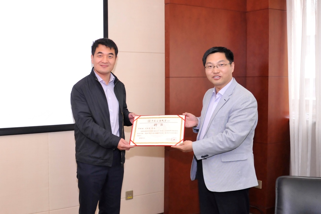 工商管理学院郭海涛院长向国家发改委产业经济与技术经济研究所工作室主任付保宗颁发MBA校外导师聘书