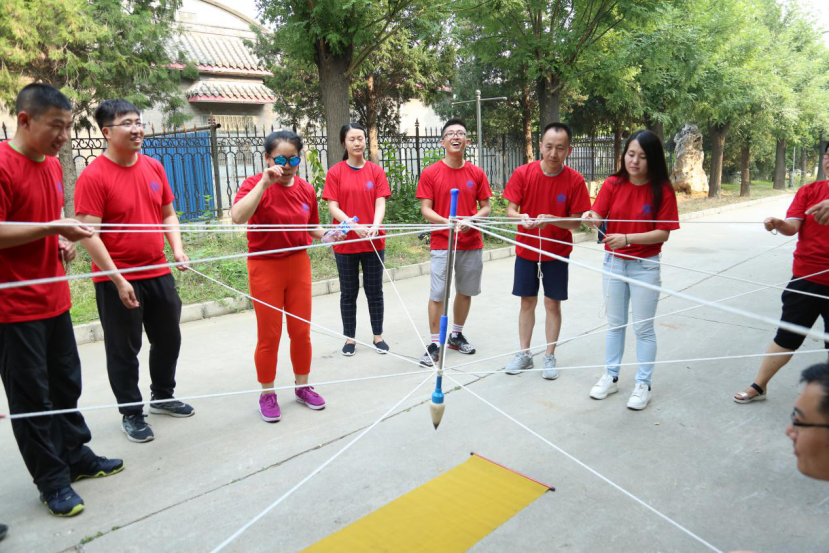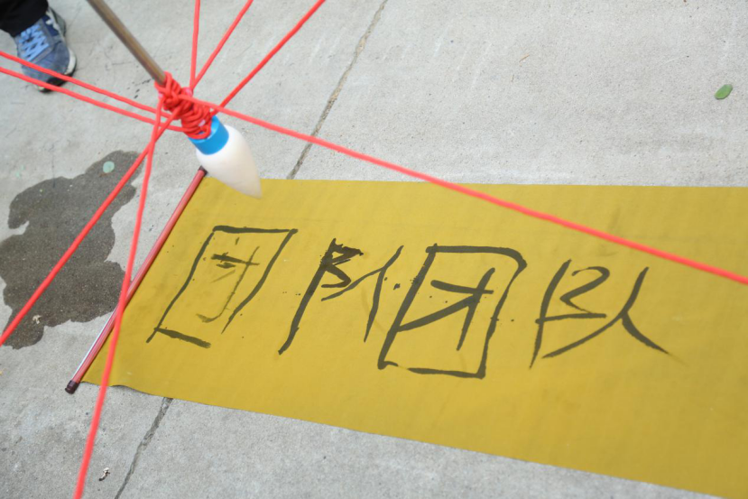 团队展示结束后,各小组迎来了第一个挑战项目——神笔马良。一只绑着许多根绳子的毛笔摆在了各支队伍面前,如何使不同方位的人共同拉动毛笔完成“团结”二字的书写,队员们纷纷献计献策。一人指挥,减小用力,四人为主,他人为辅经过热烈的讨论,大家八仙过海各显神通,顺利完成了第一项考验。