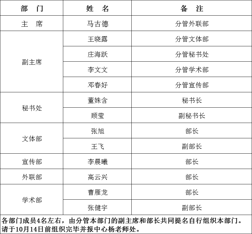 2018年9月28日,经过公开竞演,秉承公平、公正、公开的方式,采取学生打分、班委打分、第三届联合会成员打分、中心老师和领导打分的方式,最终产生第四届MBA联合会的主要成员。