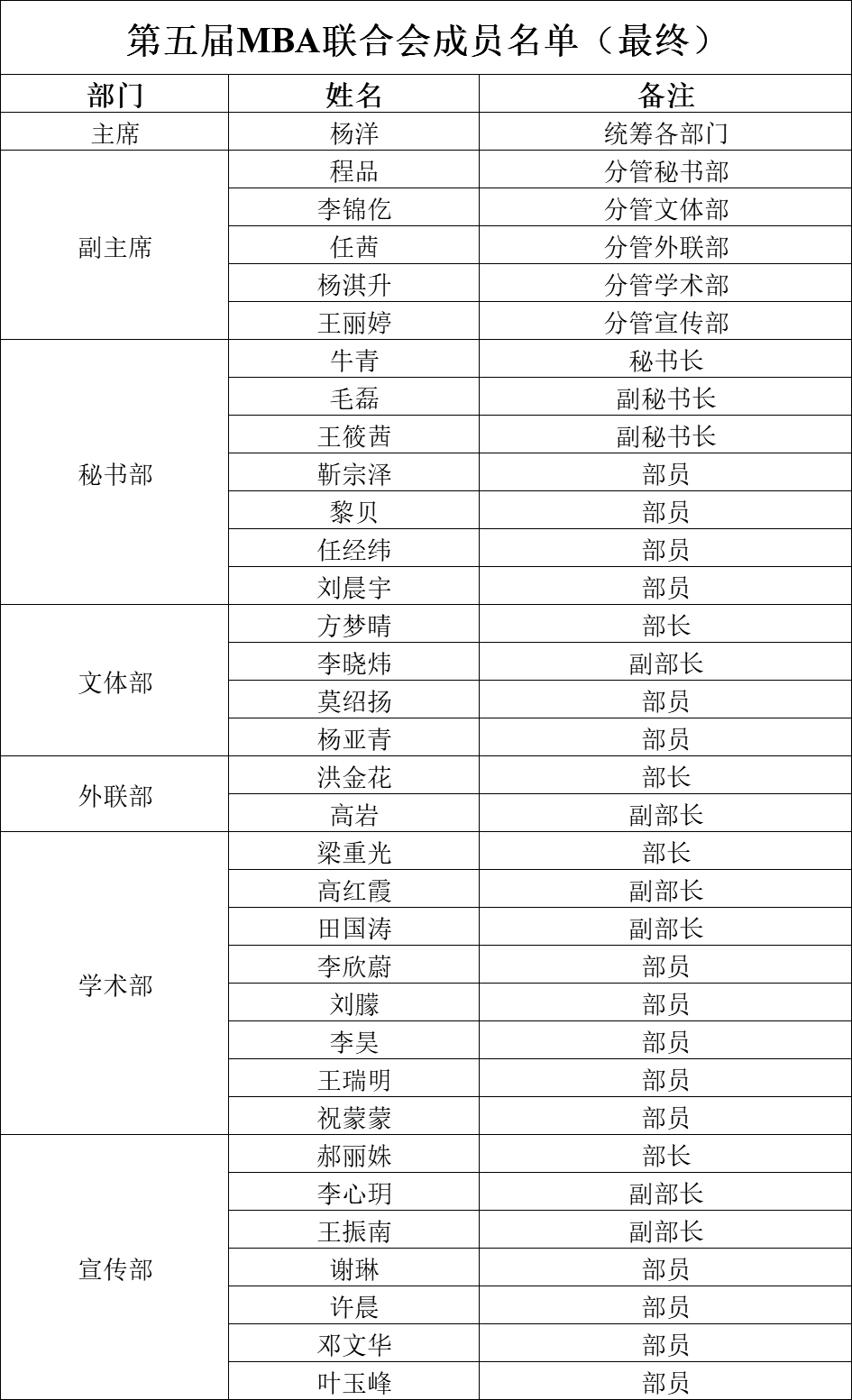 为推进MBA联合会文化建设,增强MBA学员的凝聚力和向心力,本着“学有余力、竞争上岗”的原则,经学生本人申请、组织推优、资格审查、面试竞选、试用考察等选拔环节,本届学生联合会已经产生,现将经济管理学院2019级MBA联合会成员名单公示如下: