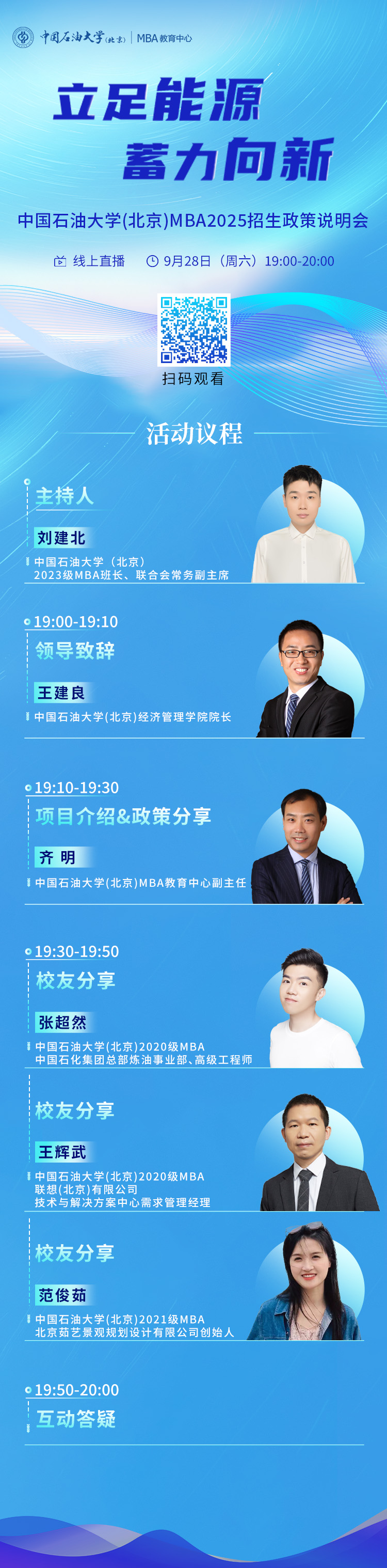 9月28日19:00,立足能源 蓄力向新丨中国天天色天天(北京)MBA2025招生政策说明会重磅来袭!官方解读项目内容与招生政策,优秀校友代表倾情分享学习经验、职业发展心得以及备考方法,全程陪伴MBA备考之旅。此外,说明会还设有互动答疑,可在线解答您关于MBA学习、招生政策及未来职业规划的各种疑惑。欢迎在线观看,邀你共同探索未来的无限可能!