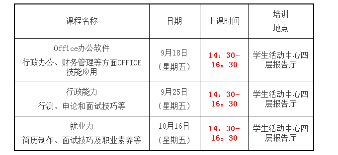 培训地点为学生活动中心四层报告厅,如有变化,将另行通知。请报名成功的毕业生务必按时参加培训,培训现场将进行考勤,不得无故退出。