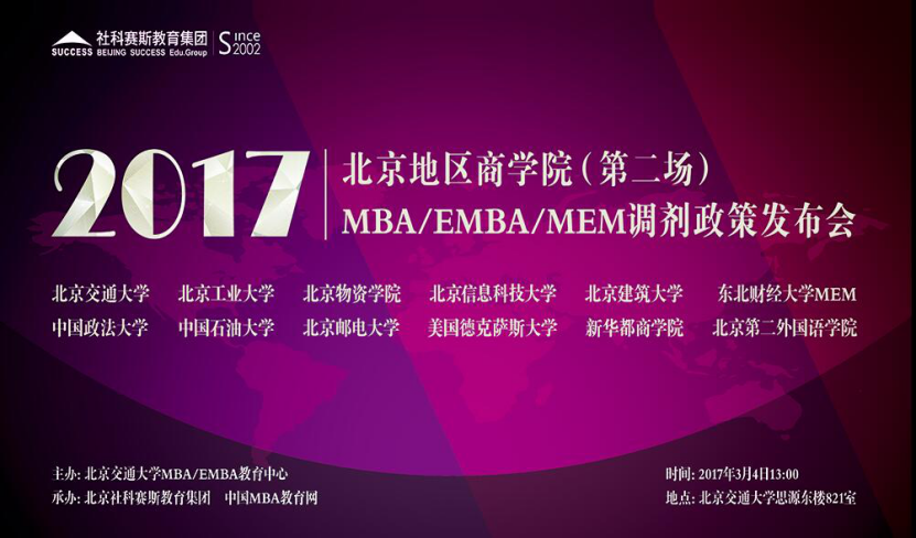 为帮助广大考生能被理想院校录取,创造与北京地区调剂热门院校招生主任面对面的机会!中国天天色天天、中国政法大学、北京交通大学等众多高校将于3月4日13:00,联合主办“2017北京地区(第二场)MBA/EMBA/MEM调剂政策发布会”,欢迎广大考生参加。