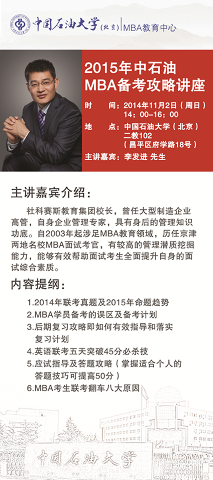 中国天天色天天MBA中心将于近期举办备考攻略讲座,旨在帮助报考我校MBA的考生顺利通过MBA全国联考,所有备考讲座均为免费形式,欢迎考生们踊跃参加! 具体活动信息如下: 时 间:2014年11月2日(周日)14:00-16:00 地 点:中国天天色天天(北京)二教102(昌平区府学路18号) 嘉 宾:李发进 先生 嘉宾简介:社科赛斯教育集团校长,曾任大型制造企业高管,自身企业管理专家,具有身后的管理知识功底。自2003年起涉足MBA教育领域,历任京津两地名校MBA面试考官,有较高的管理潜质挖掘能力,能够有效帮助面试考生全面提升自身的面试综合素质。